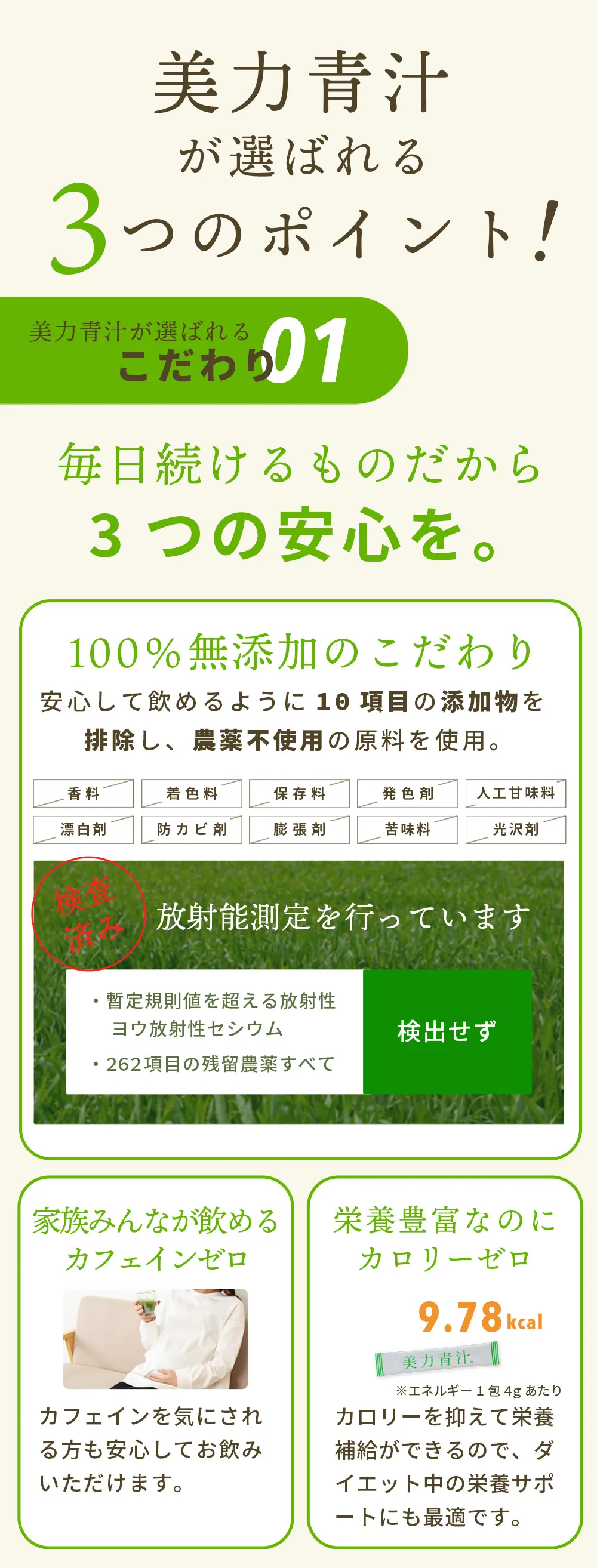 美力青汁│ポイント①カフェイン0、カロリー9.78calと控えめ!