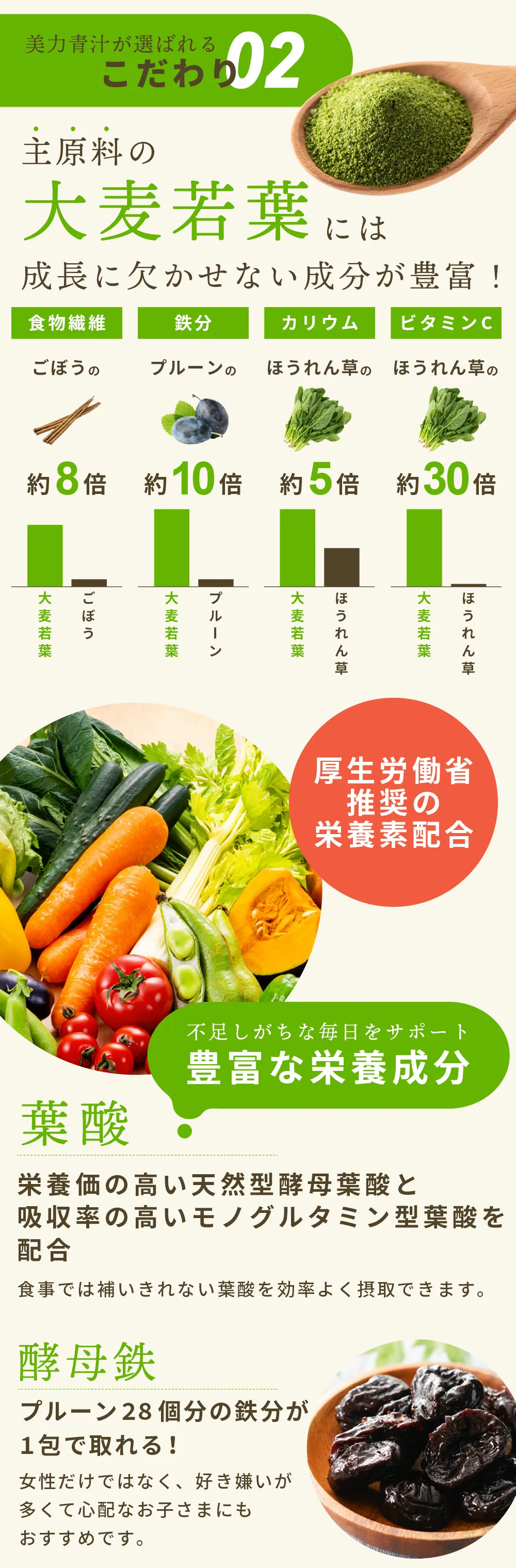 美力青汁│ポイント②成長には欠かせない成分がたっぷり含まれた大麦若葉を主原料とし、厚生労働量推奨の栄養素である葉酸、酵母鉄を配合