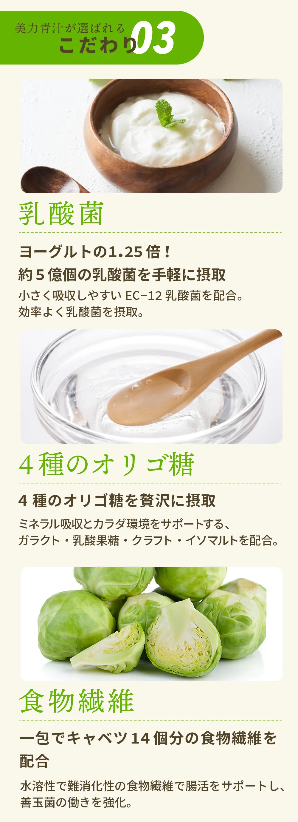 美力青汁│ポイント③約5億個の乳酸菌と4種のオリゴ糖、食物繊維などの栄養素も配合!
