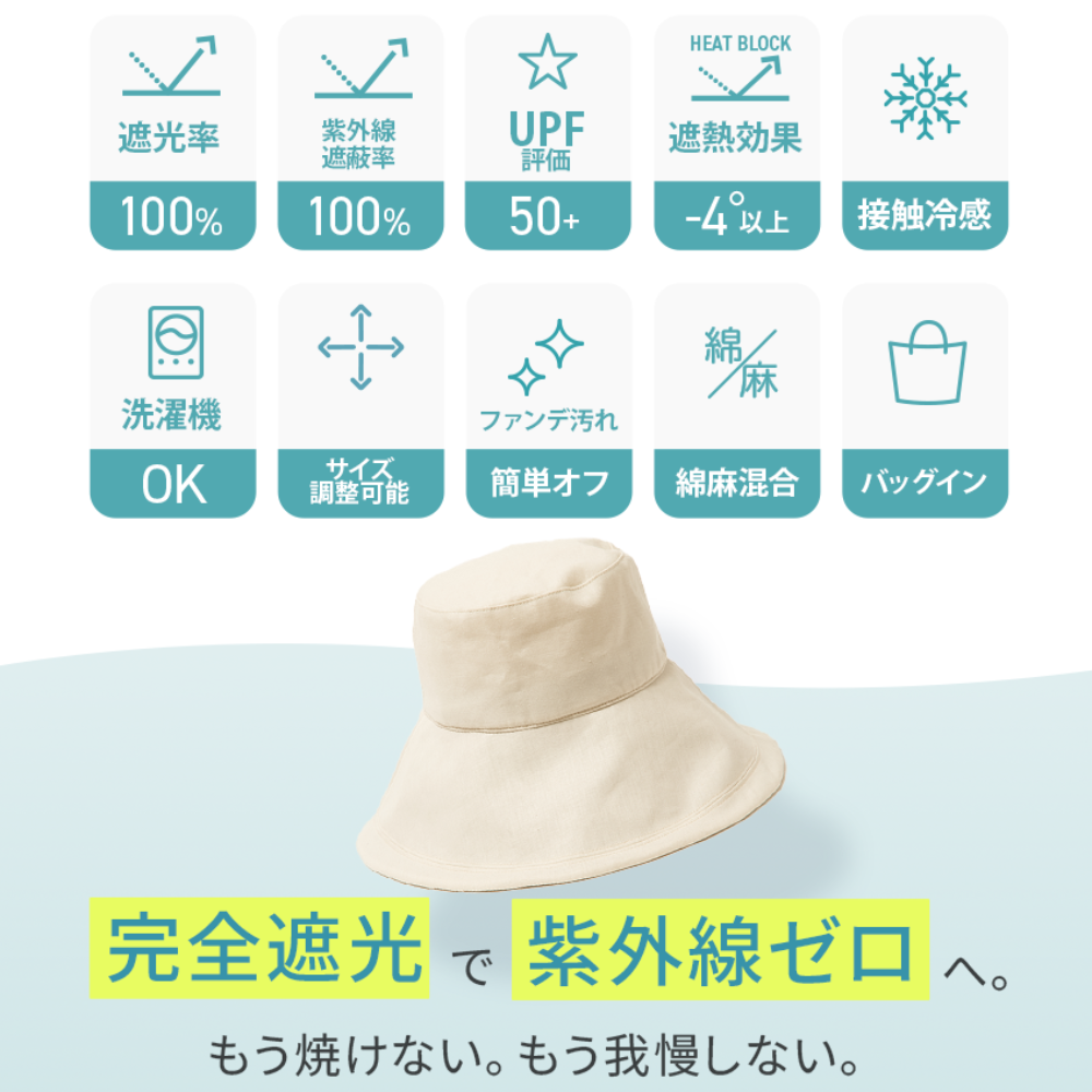 サンブロックハット│汗ばむ季節も快適、遮光率100%、紫外線遮蔽率100%、洗濯機OK、接触冷感・ファンデ汚れも落としやすい