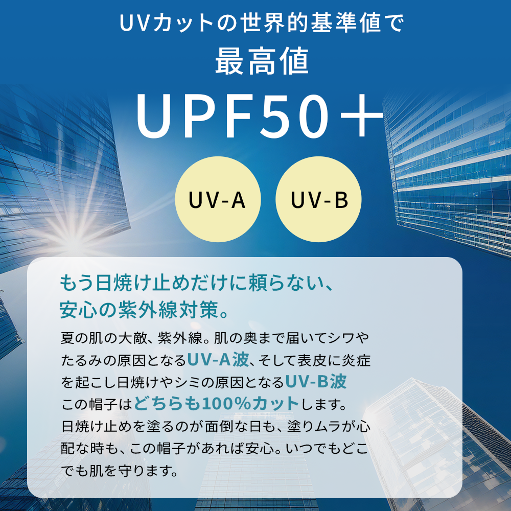 サンブロックハット│UPF50+の国際基準最高値を達成したUVカット帽子。UV-A波とUV-B波を100%遮蔽する生地が、夏の強い日差しから肌を保護します。