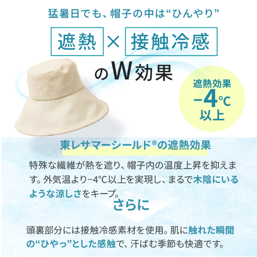 サンブロックハット│遮熱と接触冷感の二つの効果を持つ帽子。特殊繊維で帽子内部の温度上昇を抑え(-4°C以上抑制の試験結果に基づく)、接触冷感素材でひんやりとした肌触りを提供します。