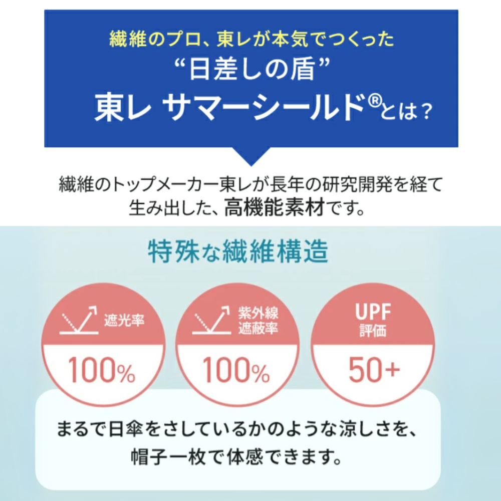 サンブロックハット│東レ サマーシールド®生地を使用したサンブロックハットは、遮光率100%と紫外線遮蔽率100%、UPF評価50+の基準を満たした高機能な日差し対策アイテムです。